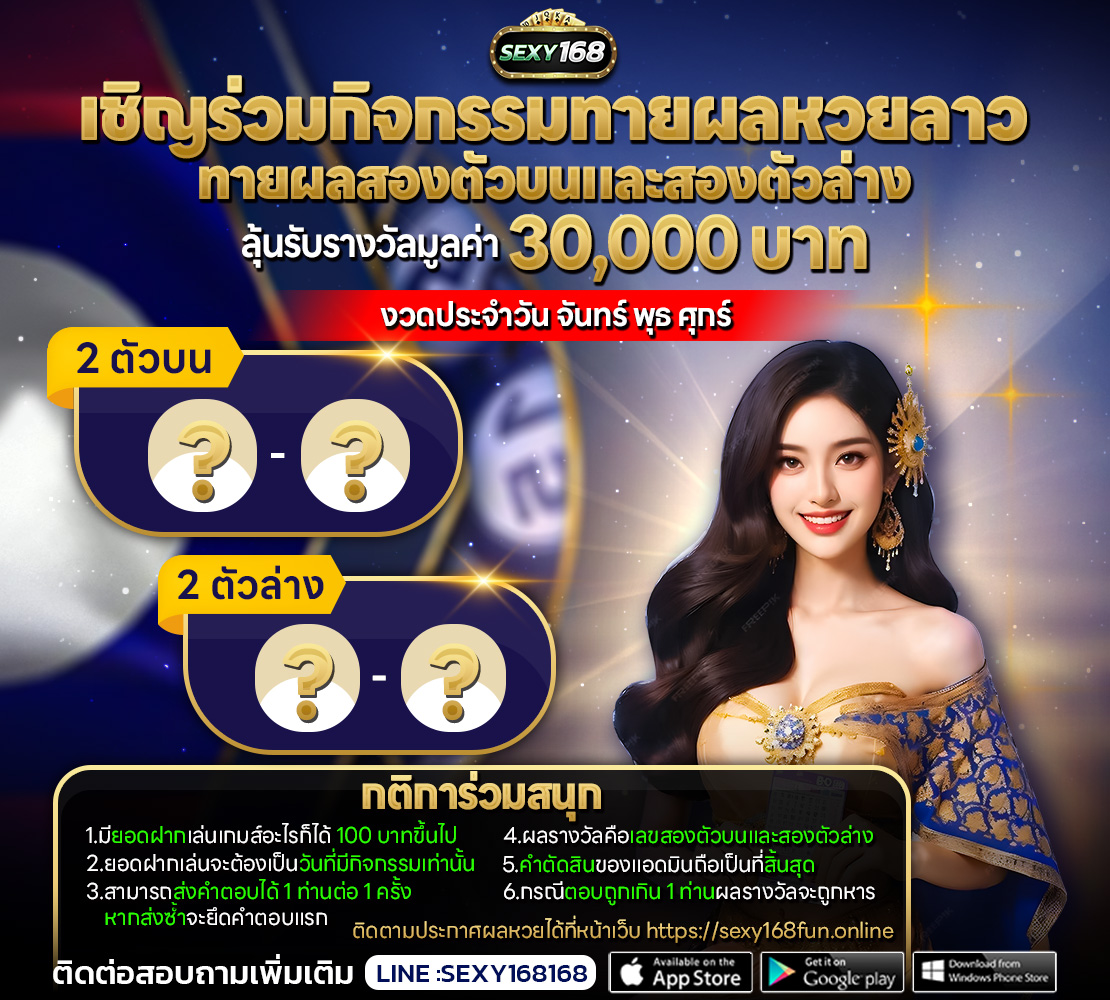 - 6.กรณีตอบถูกเกิน 1 ท่านผลรางวัลจะถูกหาร ติดตามประกาศผลหวยลาวได้ที่หน้าเว็บ https://sexy168fun.online